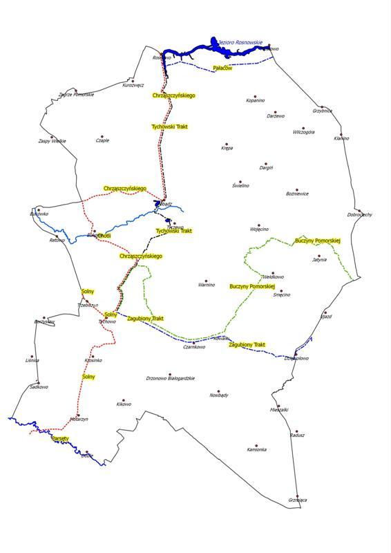 - trasa: Koszalin (Góra Chełmska) – Maszkowo – Lubiatowo – Manowo – Rosnowo –Pobądz – Bukowo – Tychowo